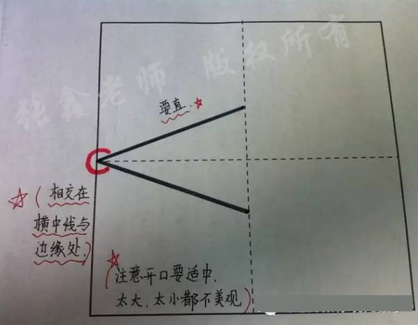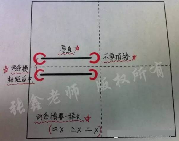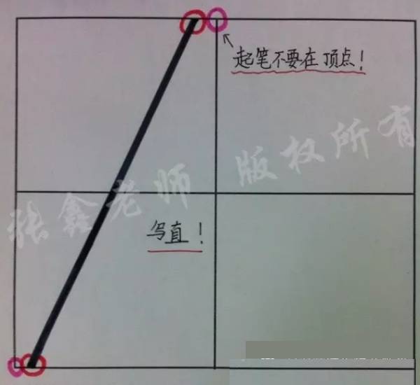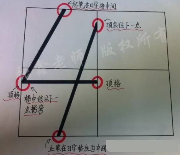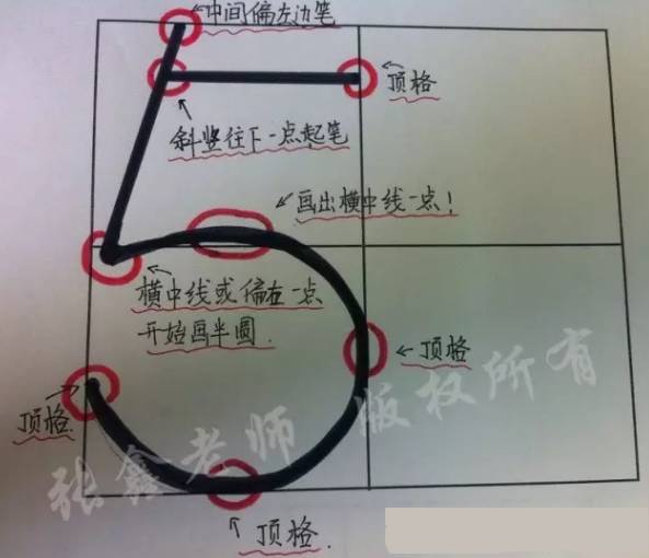 “5”的写法:从左上线微斜向左到中格略上角,再向右超过中线画一个大半圆碰右线、下限到碰左线为止。上面一行平上线下面一点,向右碰右线。