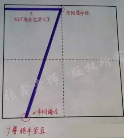 “7”的写法:平上线,从左上角到右上角,再弯斜到下面,在中间偏左的地方碰下线。