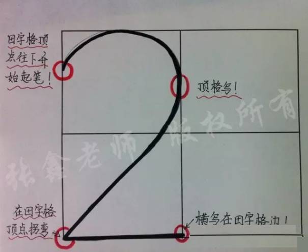 “2”的写法:起笔碰左线,再向上,向右碰线,略成半圆,斜线到左下角,碰线一横。
