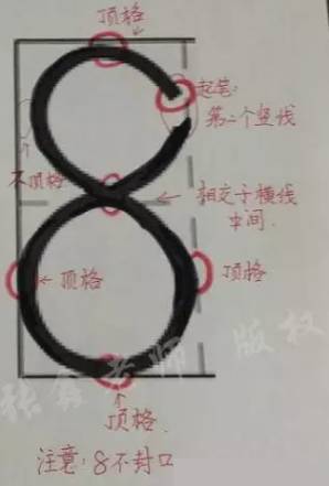 “8”的写法:从右向上到左一个半圆,另向右下,碰右线、下线、左线、回上去,在虚线以上和原线相交、直线到右上角附近与起笔的地方稍离开一些为止。(8是不封口的)