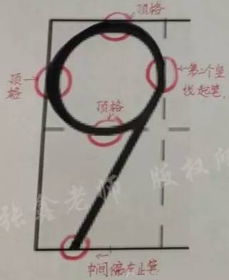 “9”的写法:上面一个圆是长圆,稍斜些,但四角碰线,在右上角附近向左下一竖到下线中间。