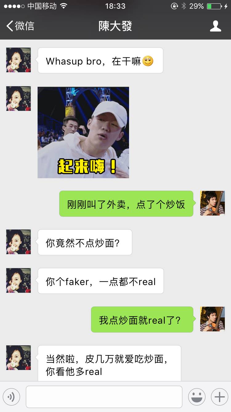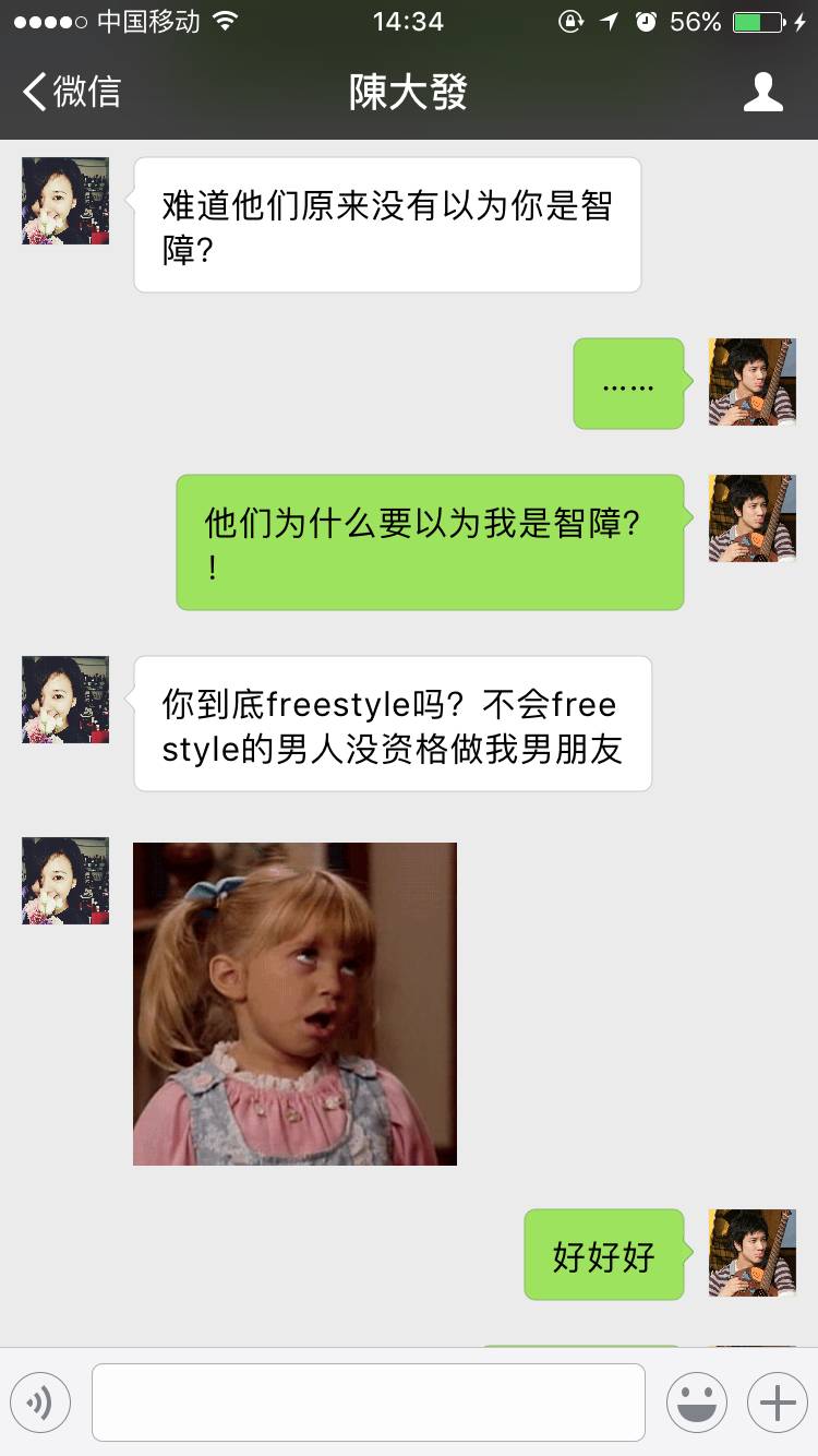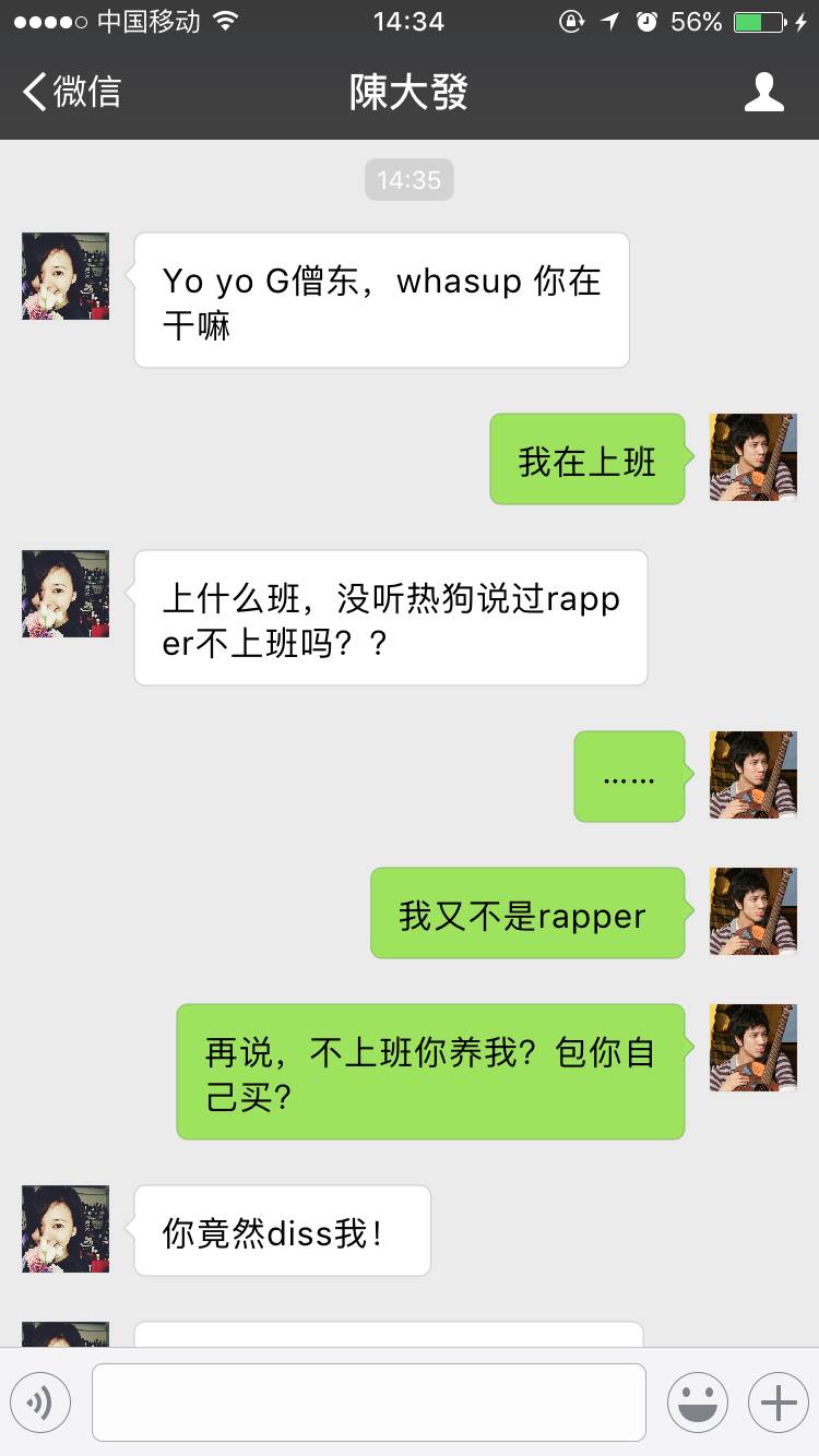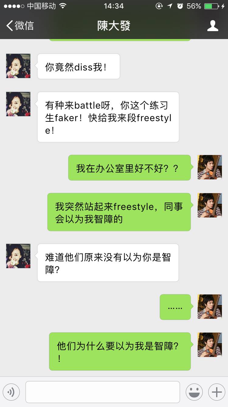 比如突然脑抽用嘻哈语言和我聊天,并且突然要我来段freestyle。