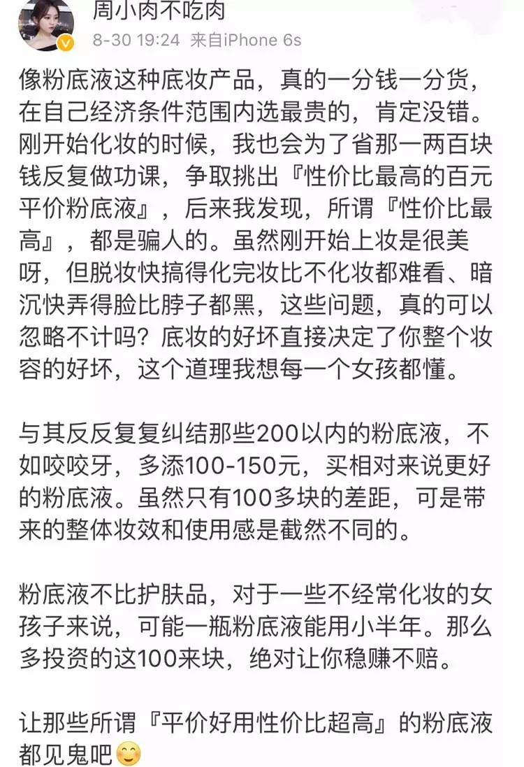 昨天在写文的时候,我一直在纠结,写这期秋冬粉底液合辑的时候,要不要安利一两百块钱的平价粉底液,后来我认真地想了一下,还是算了。前晚我在微博上发了这样一段感想: