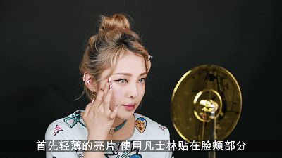 现在要贴上妆容点睛之处的亮片,使用凡士林打底,再用之间轻轻沾取细闪粉涂在脸上。