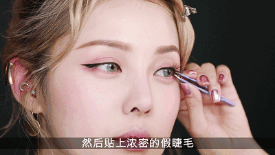睫毛的部分,首先会用睫毛夹将睫毛夹卷睫毛,再贴上浓密的假睫毛。