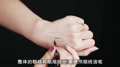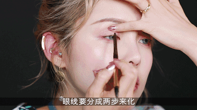 画眼线可以分为两个步骤,首先用棕色眼线笔填充粘膜部分。