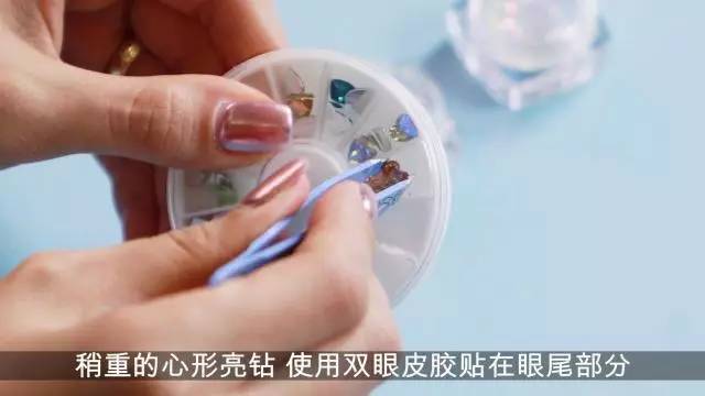稍重的心形亮钻,使用双眼皮胶贴在眼尾部分会更牢固。