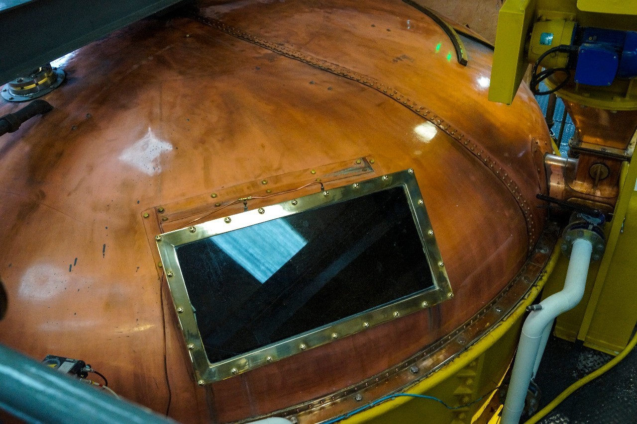 关于是爱尔兰人还是苏格兰人率先使用蒸馏制造威士忌的争论到今天还未停止。当你行走在蒸馏器所在的厂房,巨大的热浪几乎是扑面而来,从地下一直延伸到厂房顶端的巨大蒸馏器如同一座巨塔。每两个为一组闪烁着金属的光芒——铜,全部用铜制造的蒸馏器是酒厂中最昂贵的设备,酿造好的“啤酒”通过管道进入第一个蒸馏塔,所得的液体再进入第二座蒸馏塔获得更加纯粹的“生命之水”。