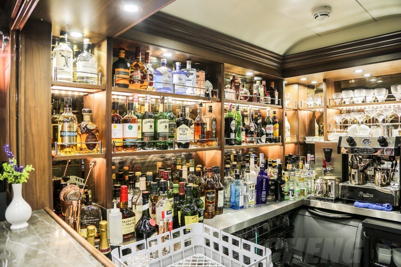 车尾的观景车厢Kildare融合爱尔兰沙龙的温暖气氛,交错的沙发椅与茶几是最好的社交场所,几乎所有的客人都愿意在这里度过车上的闲余时间,全天运营的酒吧也在这里,你几乎可以尝遍爱尔兰以及苏格兰所有的威士忌,也可以点上你最钟爱的鸡尾酒。