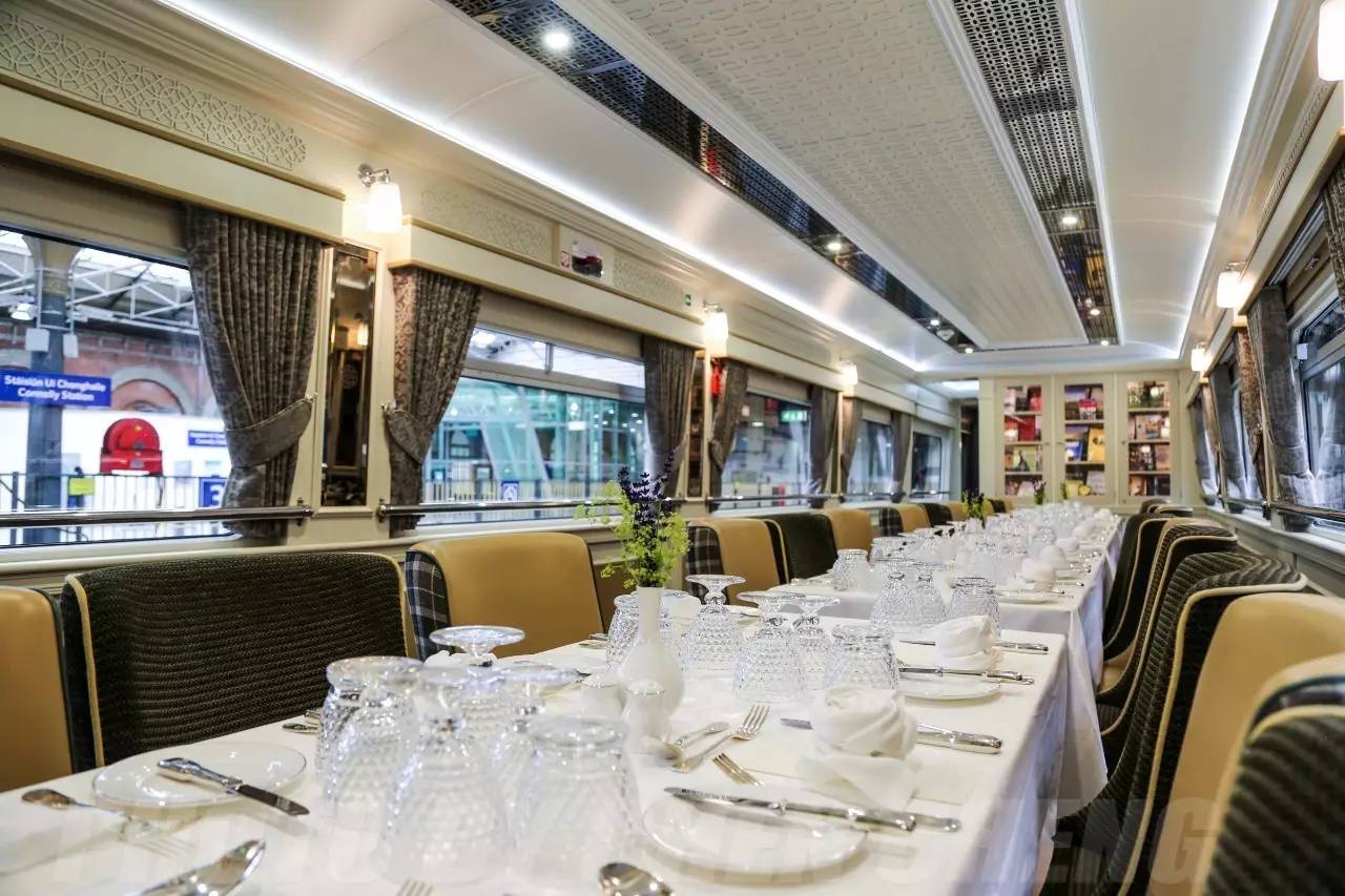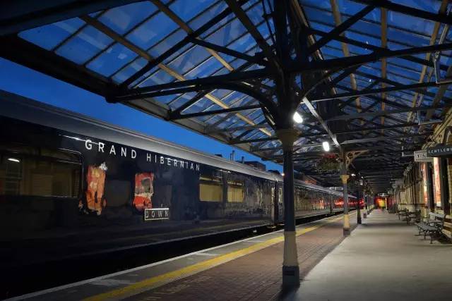 你也可以在站台的晚风中散步,看着列车上的灯光洒在站台上,车上的窗帘已经放下专为迎接夜晚的到来。在Grand Hibernian 的行程单上,早间并没有行程的安排,你可以惬意地在餐车点上一份爱尔兰风格早餐,当然还有咖啡与茶。