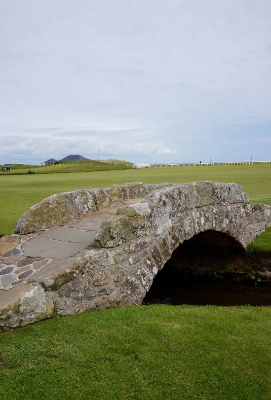 在1号洞的发球旁就是18号洞的结束,如同一个轮回,多变的海风在上空吹拂,不时有海鸥从头顶飞过。在这个球场上挥杆的球手似乎都显得有些拘谨,不仅仅是因为众多的游客在旁观,更因为内心的激动。“人们真的喜欢这里。几乎每个人都要到石桥旁合影,我建议他们需要小心对面的发球台,毕竟阻挡发球或是被球打到都不是好事。”