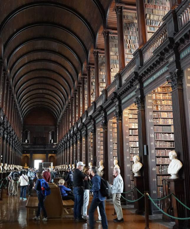 师生们似乎熟悉了这种情况,有条不紊地在校园中生活。古老的凯尔特人图书馆是每个游客的目标,在“长厅”中,巨大的书架上的古老书籍并非摆设,甚至最早的13世纪古籍,在校的师生都可以申请借阅。校外的研究者则需要提前10周进行申请。在直达屋顶的书架旁伫立着的是世界历史上最著名的智者的雕像,从苏格拉底到培根,步行其间,似乎可以感受到知识变成了实质,让你可以去触摸与感受。