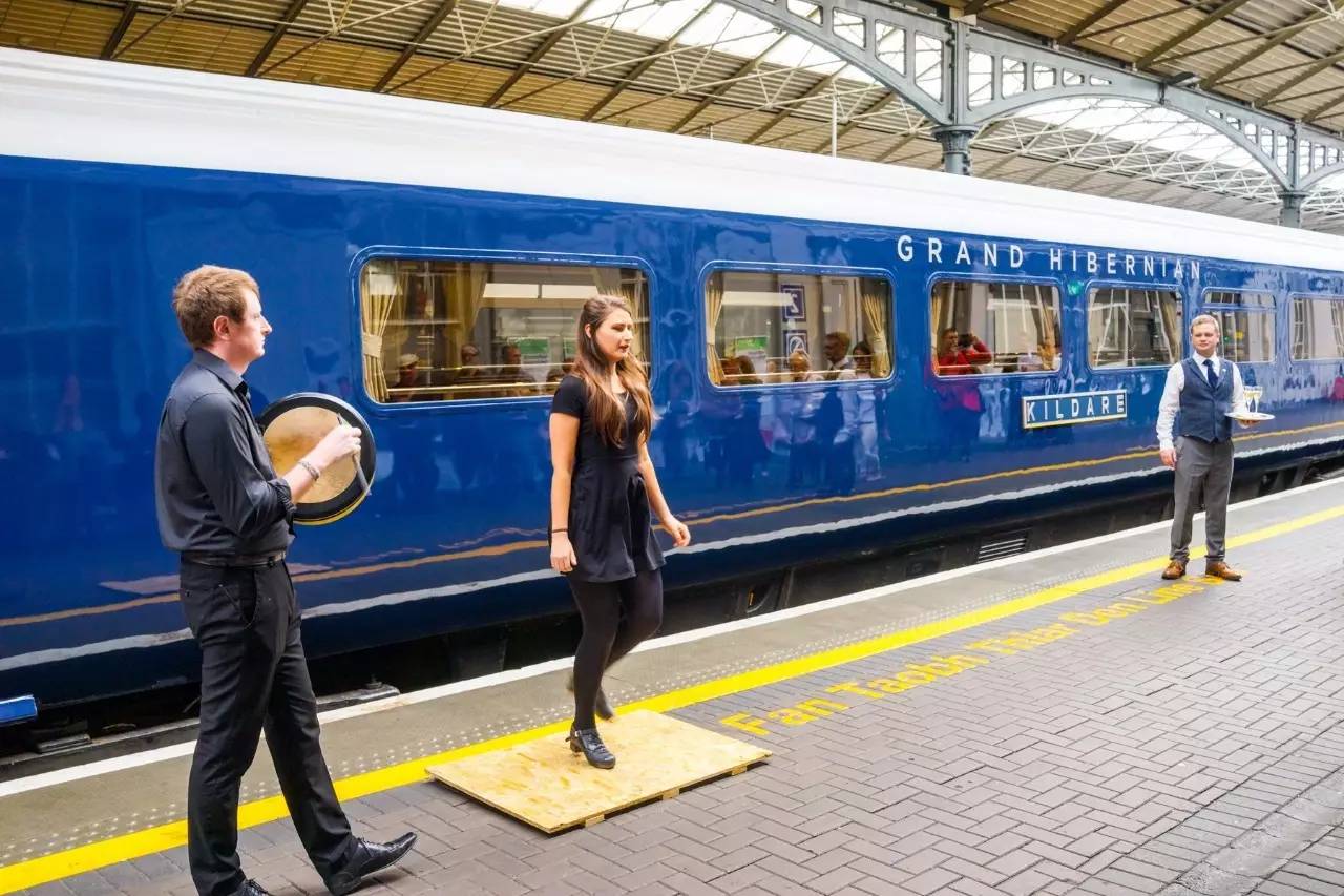 从酒店出发乘坐专用巴士穿过都柏林城区,你可以毫无阻碍地走入Heuston火车站的站台,深蓝色的专列已经准备就绪,年轻的爱尔兰舞者和她的伙伴正用快节奏的音乐吸引着你的目光,香槟是登车前的饮料,红毯则是站台上醒目的提示。其他乘客们赞叹的目光让你知道,当你乘坐这趟列车欣赏美景的同时,你也成为了一道独特风景。