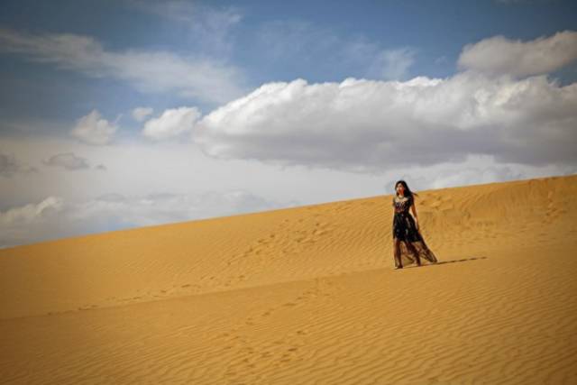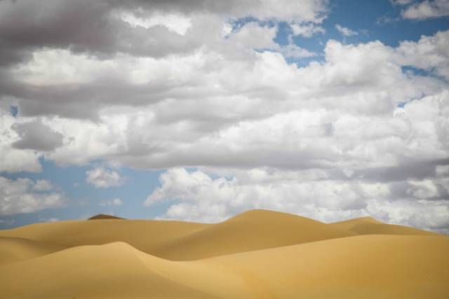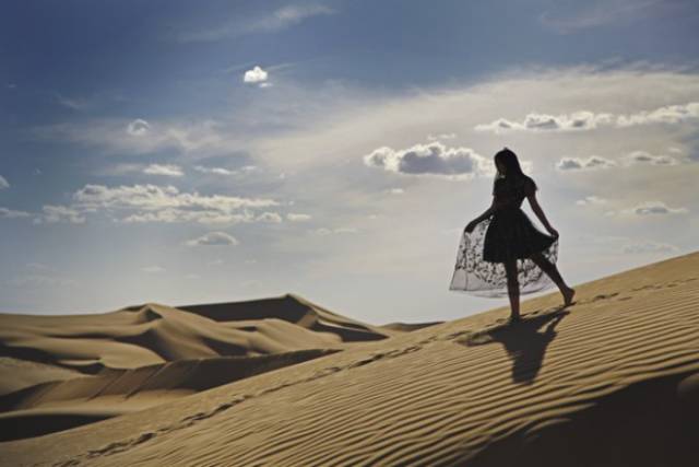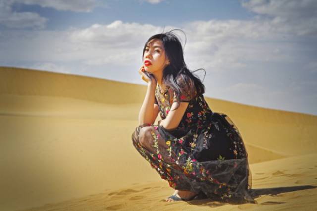 云朵在空中变换着形状,沙山的光影也在流动,风很大,虽然暴晒但一点都不热,堪称完美!换上黑色的裙子继续拍~