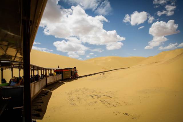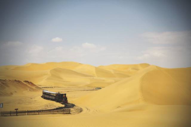 背后就是小火车,在金黄沙丘和蓝天下行驶,宛如童话呀。