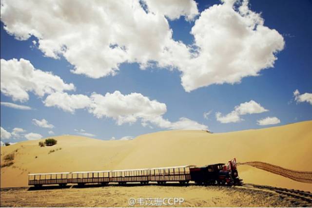 蓝天白云配黄沙,火车缓缓开过来,真的很像童话里的场景。
