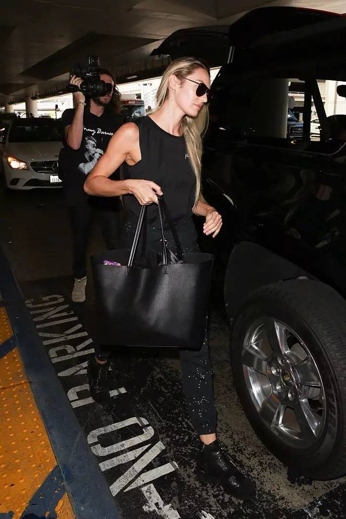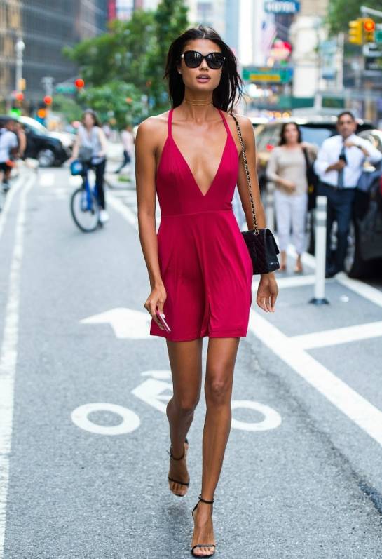 ▼Symone Challenger的黑色吊带连衣裙,大开叉又若隐若现,尽显长腿优势。
