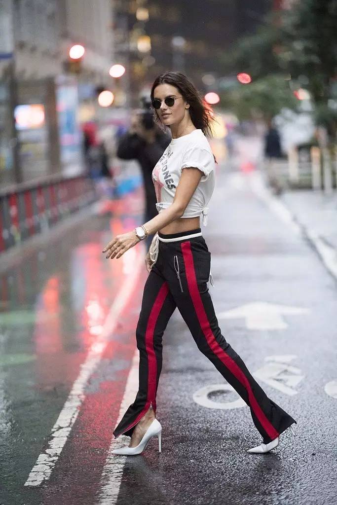 ▼美A(Alessandra Ambrosio)状态大好!夸张图案的半袖T恤和开叉运动裤,玩起了高街风。