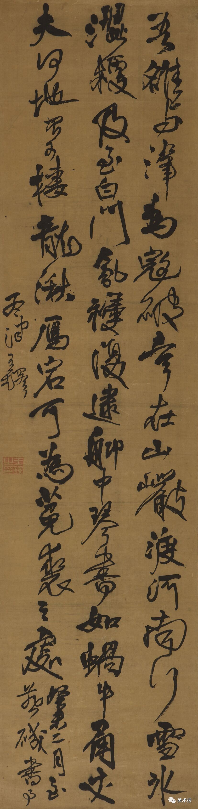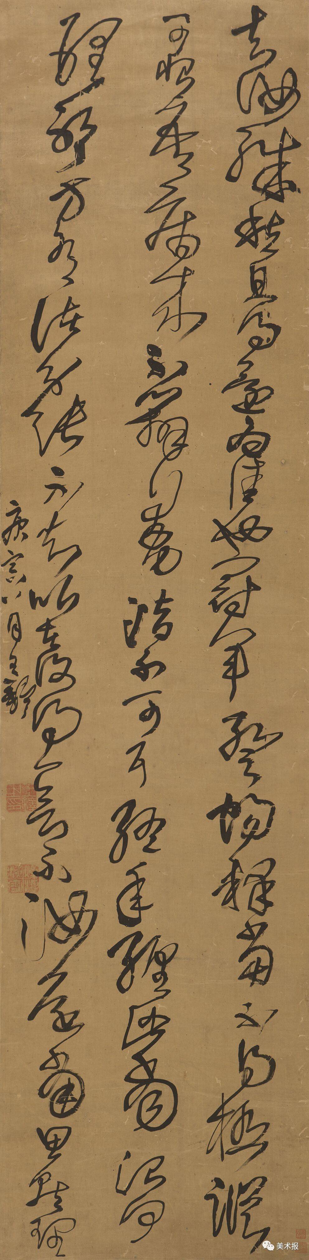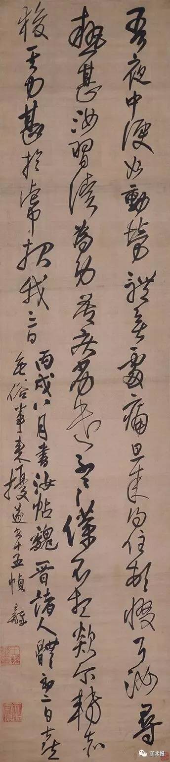 然而,全轴内所有字的结体与原帖一致,可知王铎当时是看着拓本在临。这件作品上,王铎未受制于文本,不习其气质,却拓字为大、重创章法,发挥纵势以应立轴——这一晚明书作的主要形制。
