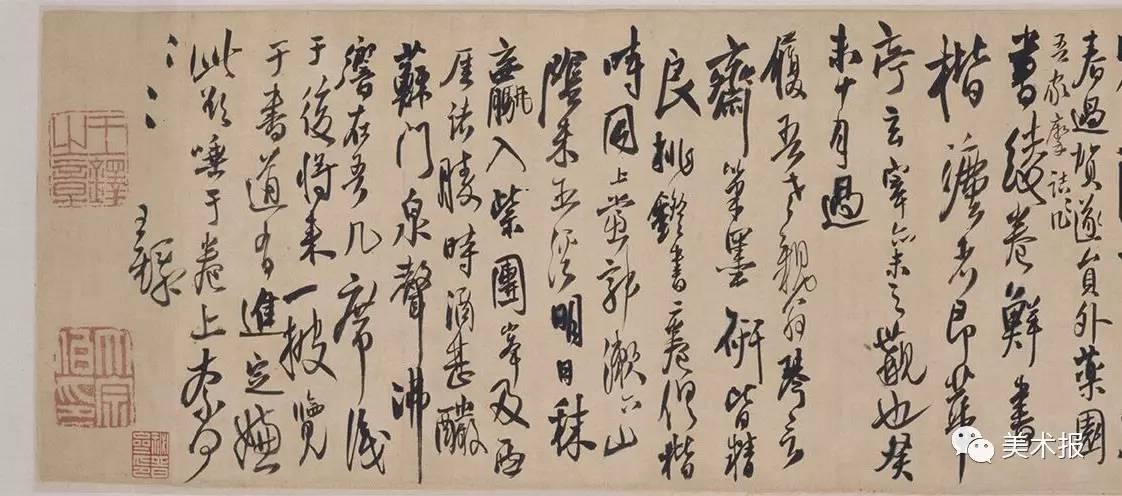 书此恬淡二诗,颇合王铎彼时心境。卷上跋云:“明日秣骡,入紫团峰及西厓诸胜,时酒甚酽,苏门泉声沸响,在吾几席。”王铎虽未入山,既听见泉涌于身旁。