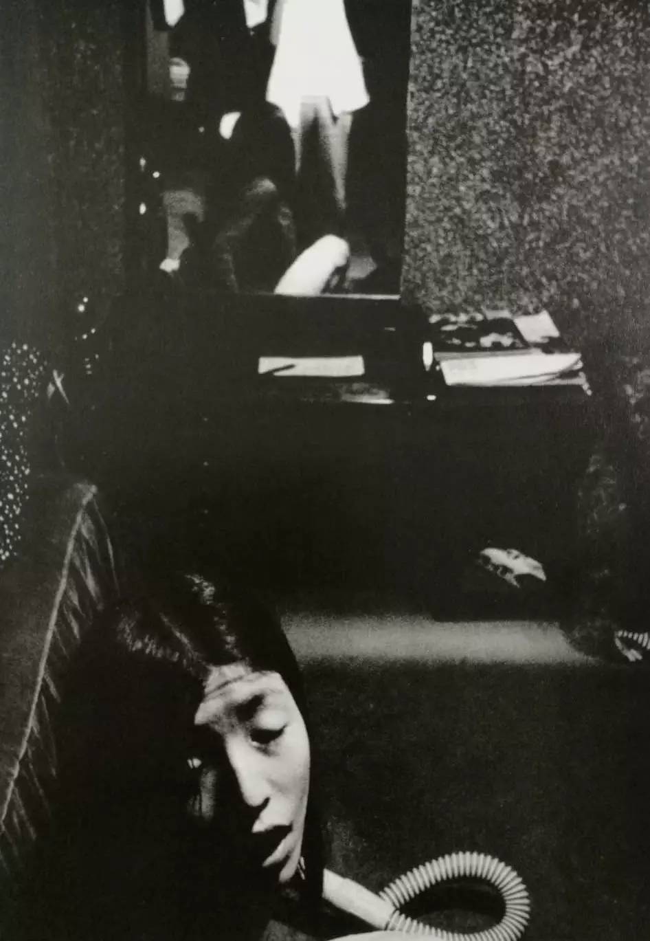 卓马发表于《挑衅》的一帧代表作,是摄于逗子自宅中的作品,也是一帧让观者揪心之作。连墙壁都涂成黑色的房间中,左下角的女人面向画面,做出一副不堪痛苦的挣扎表情。而她的脖子上,缠绕着吸尘器的蛇皮管,令读者本能地联想到扼颈自戕。但其实,很可能是正在清扫地面的女子,在调整吸尘器的位置时,偶然做出的一个表情,被定格在了摄影家的胶片上。