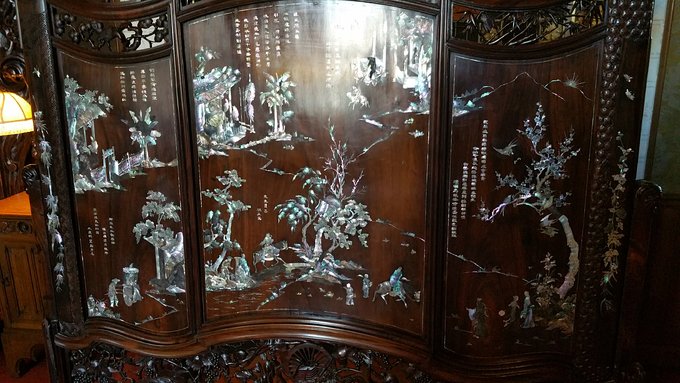 城堡里面每个厅都有志愿者,可以跟他们问一些感兴趣的问题,他们也会问我们一些问题。这次在一块木质的屏风边就被问到了,因为屏风来自中国!好开心!