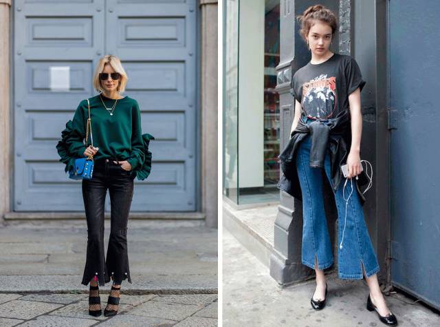 喇叭形阔腿裤非常实穿,你还可以在里面藏一双恨天高,甚至是松糕鞋都没问题,因为裤腿够长,什么都看不见了。▼