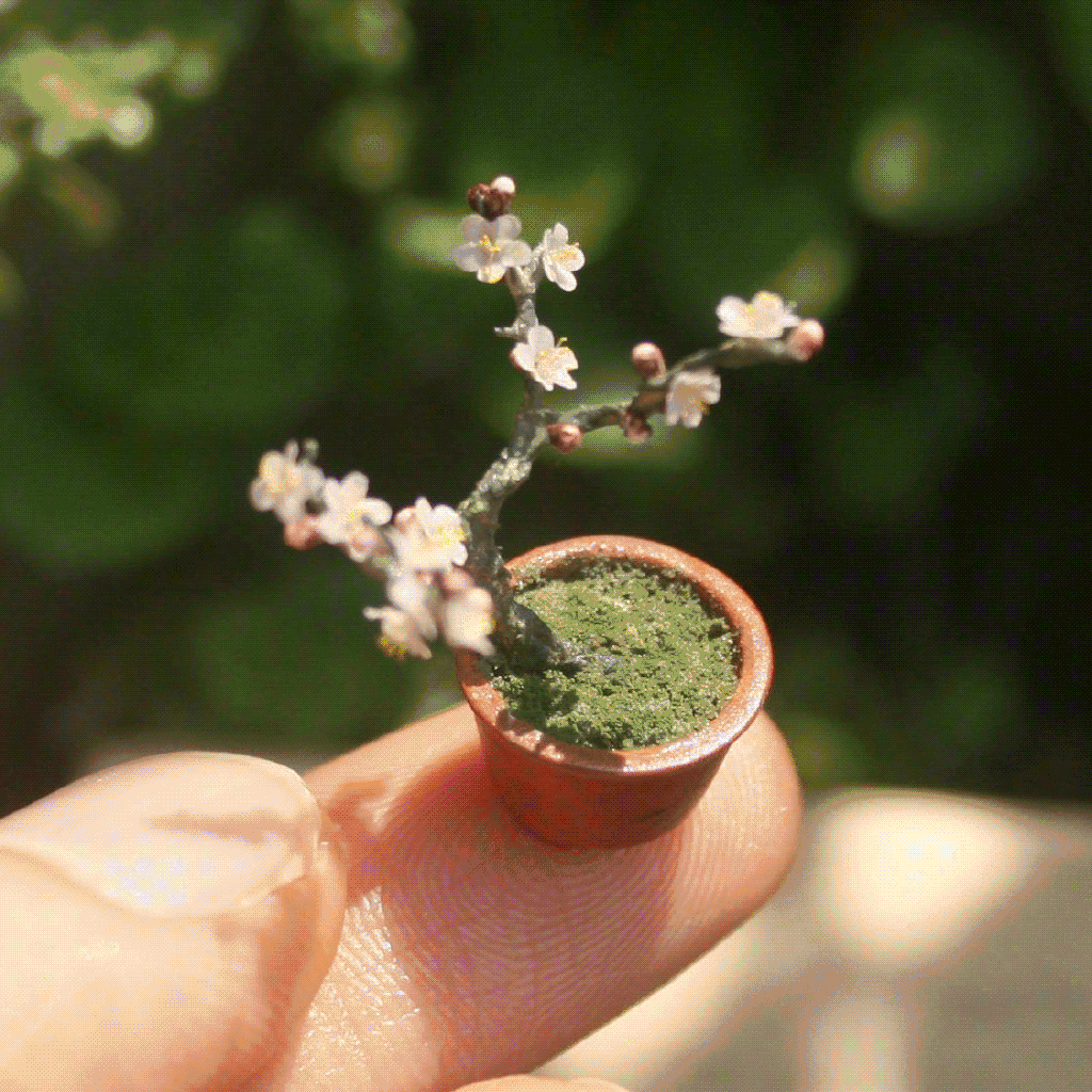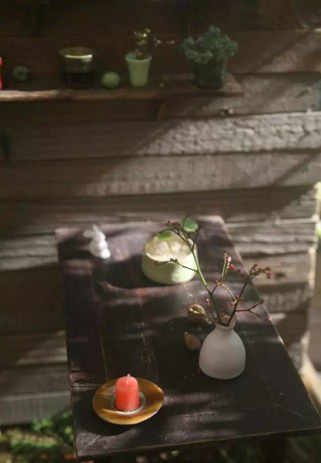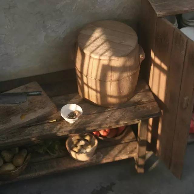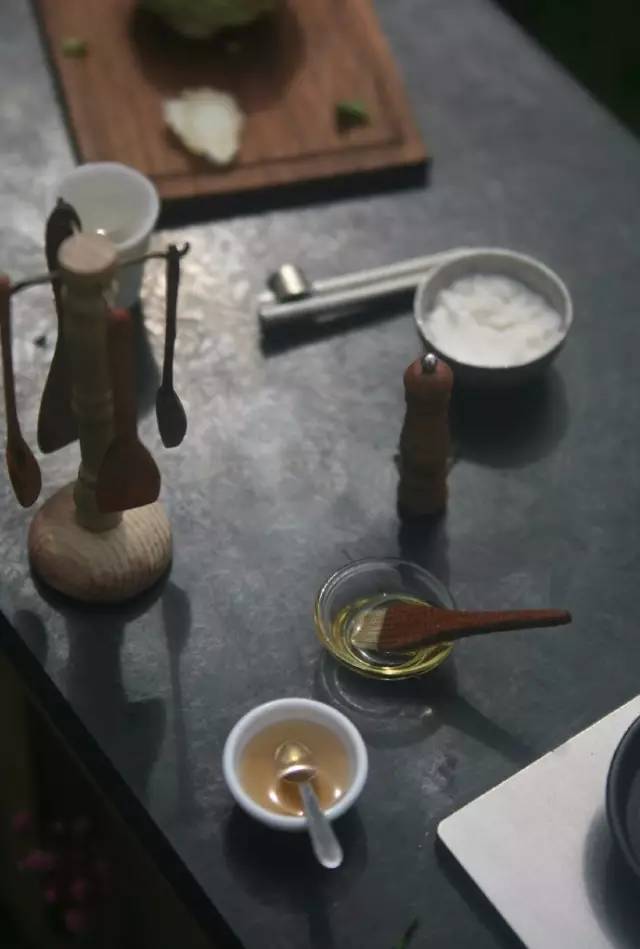 西树将记忆与想象中的场景按照1:12或者1:20的比例缩小,再细细打磨真实的材料制作出各种小物件,手掌大小的床褥、针一般粗细的毛笔、还有精细的木椅、瓷壶、碗筷、火炉、砧板、菜刀、水龙头、蔬果等等,他尤其热爱园艺,也留心生活里每一个不经意的细节,正是如此,缩小后的一砖一瓦、一草一木经过他的雕琢不仅没有因为变小而走样,反而比真实生活里的样子更充满温度。