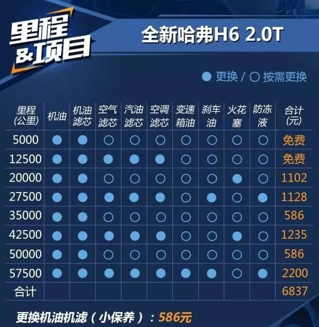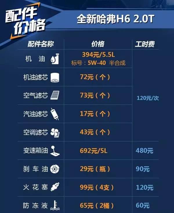 从其保养明细手册上看出总体零件维护周期都挺正常,唯独火花塞和哈弗H6一样,2万公里左右就需要更换,这难道是自主发动机的通病吗?好在原厂的火花塞并不贵,换起来车主也不会有太大痛苦。5万公里总保养花费为4713元,每次小保养的价格为629元,略微偏贵一丢丢。