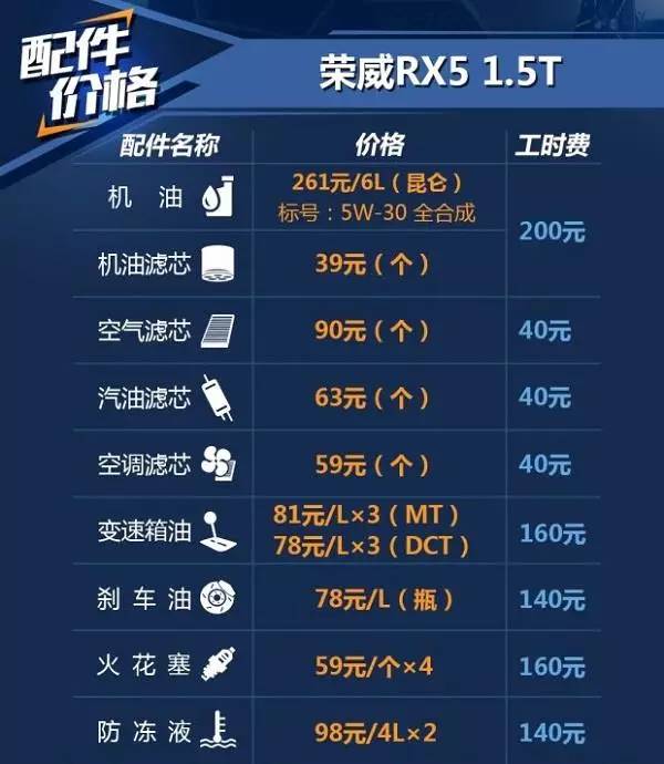 荣威RX5的保养价格清单中,体现了“人工贵于物料”的理念,6L的全合成机油只需261元相比哈弗便宜了不少,然而更换一次机油的工时费就要200元之多!在其他配件更换周期方面,RX5比较正常,例如5万公里更换的防冻液和4万公里更换的火花塞等,比哈弗H6寿命长了一倍。