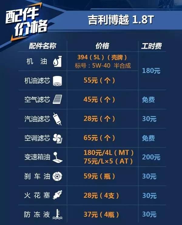 在材料价格方面,博越的机油就可以让保养者喝一壶的,半合成机油虽然是壳牌,但其394元的售价和180元的工时费估计是这四车中最贵的。不过在更换较为简单的空气滤芯和空调滤芯时工时费是免费的。