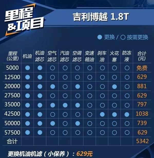 博越的首保里程为5000KM,其次每保养间隔为7500KM/次。首保赠送机油、机滤和工时费。