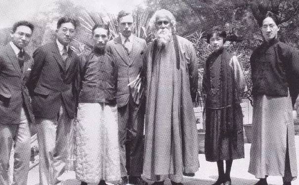 △泰戈尔(右3)与林长民(左3)、林徽因(右2)、梁思成(左1)、 徐志摩(右1)