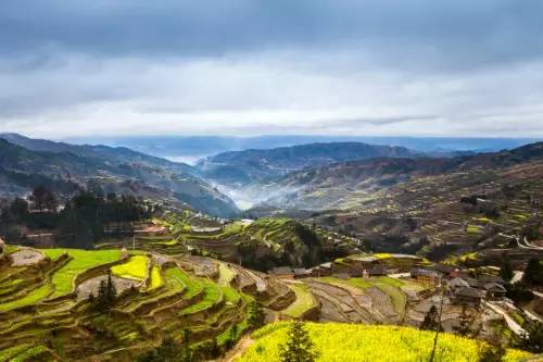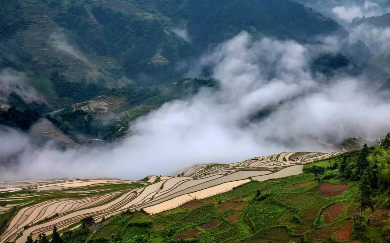 一路看见壮观的梯田层层叠叠,绿色的田埂象画框一样勾勒出梯田的轮廓,很多梯田内还有一片片的白萝卜花、油菜花,迎着初升的阳光煞是好看,一切都显得那么静谧。