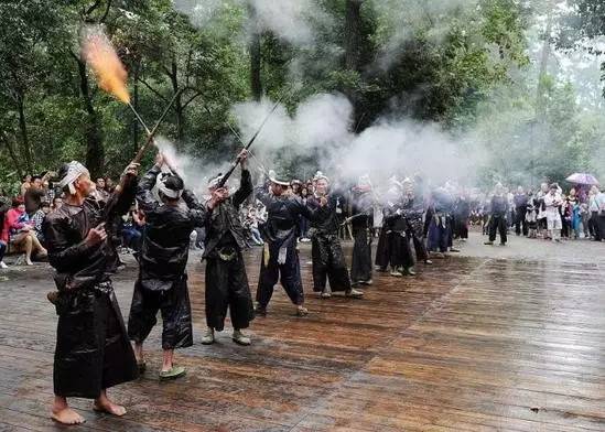 苗寨特色活动,一身威武的岜沙男子在寨门前吹奏芦笙、芒筒,岜沙姑娘用牛角杯敬上拦门米酒,一曲笙歌奏毕,三声铁铳响起,火枪对天鸣放。