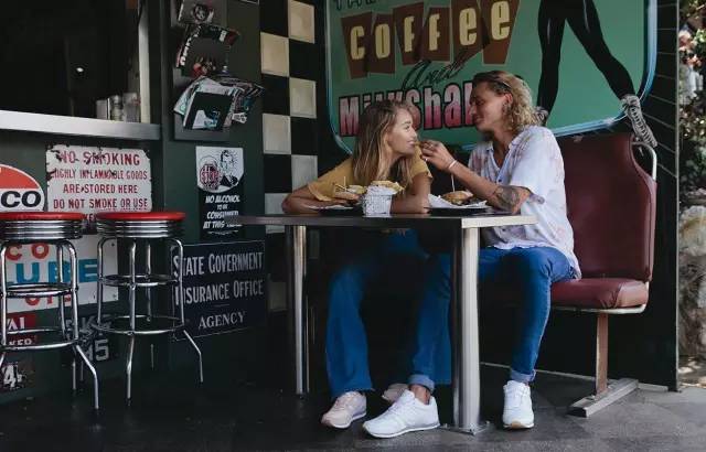 小白鞋上脚后,就有一种青春无敌的感觉,两人一起漫步街边,一派偶像剧风范。
