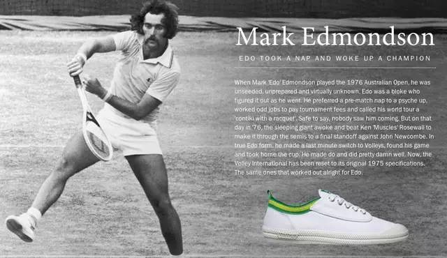 1976年传奇运动员Mark Edmondson,在澳大利亚公开赛中穿的就是volley的小白鞋,还赢得了大满贯。