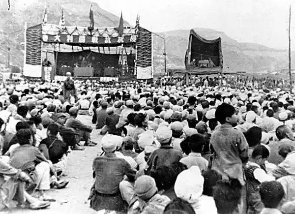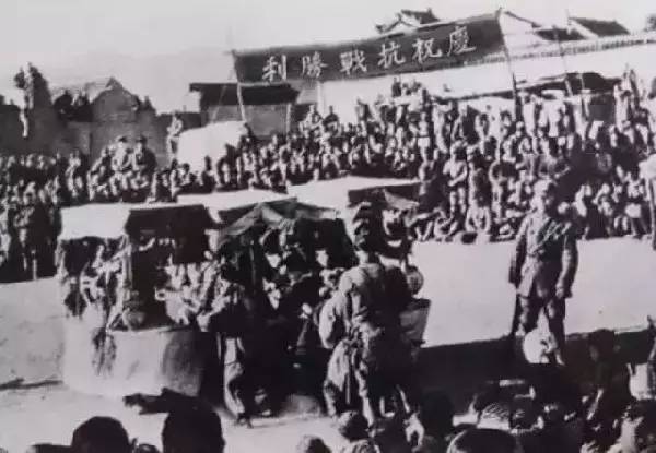 9月5日下午2时,延安各界在延安南门外广场举行了庆祝抗日战争胜利大会。会标为:全国人民团结起来,坚持和平、民主、团结,建设新中国。“和平、民主、团结”为当时全国共同的口号。