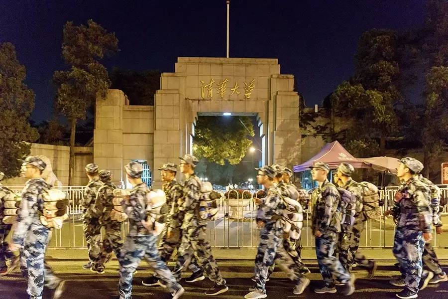 清华大学新生进行开学后的军训,图中,他们正展开20公里的拉练训练。根据媒体报道,今年入学的清华大学新生中,1999年出生的学生占比最多,被认为是清华园迎来的最后一批九零后。