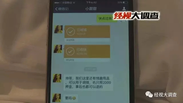 廖某选择好“小姐”后,这名自称“经理”的男子提出要先交200元定金,然后又索要交2000元保证金,并称这笔“保证金”是押金,事后可以退还。