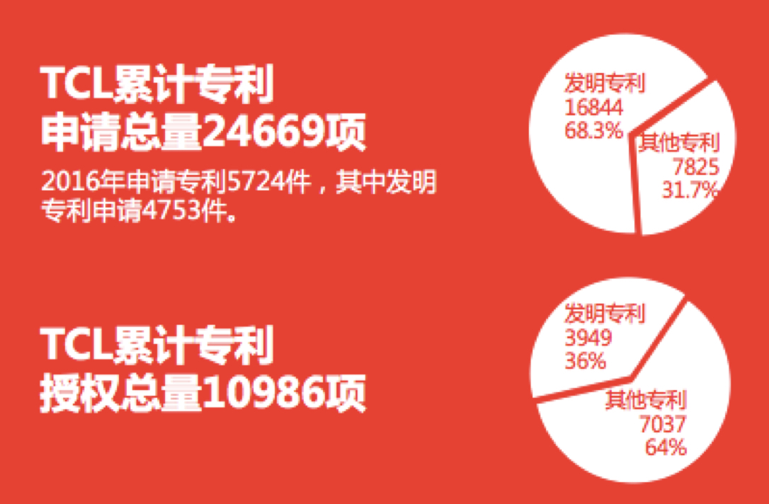 TCL 全品类创新产品集体亮相 IFA,展现了强大的科技力和品牌力 聚焦研发和产业链布局,TCL 赢得全球竞争先机 TCL 近年来能够频繁获得国际权威机构在技术创新领域的肯定,是其多年来坚持研发投入,进行技术积累的成果。据了解,TCL 在全球范围内,已经拥有 23 个研发中心,共有 7000 余名研发人员,每年的研发投入达销售收入的 4% 以上,2016 年研发投入 42.7 亿元。专利申请已累计 24669 件,专利授权已累计 10986 件。截至 2016 年底,TCL 集团历年专利申请量在国内同行企业中排名第五,发明专利申请量在国内同行企业中排名第四。2016 年华星光电在国内企业 PCT(专利合作协定)国际申请量中排名第四,全球排名第 16。