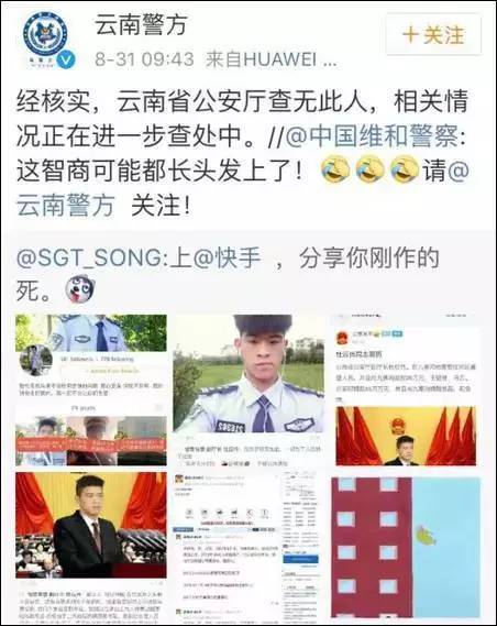 30分钟后,云南省公安厅官方微博发布辟谣信息:经核实,云南省公安厅查无此人,相关情况正在进一步查处中。