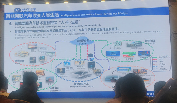 互联方面,长安从国家拿来了项目,做了一些工作。智能互联,我们这里分两部分,一个是跟安全相关的,近距离的,叫 V2X,另一个允许延时,数据量比较大,比如车载,相当于传统的延伸。