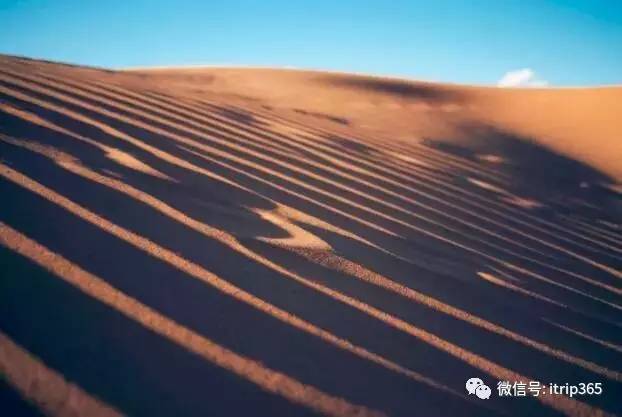 巴丹吉林沙漠美在日出时的金辉万丈。那随着朝霞变换色彩的深深浅浅的沙漠,在晨光的雕刻下,彰显着如波浪般的纹理,倒映着驼队斜长的身影。