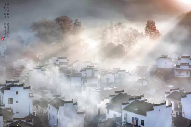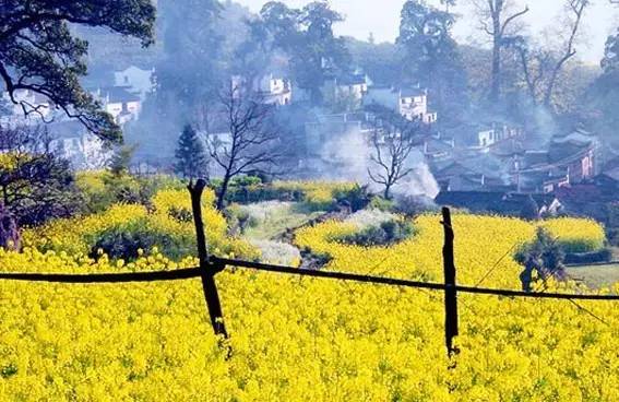 满山黄灿灿的油菜花、黛瓦粉壁的徽派建筑