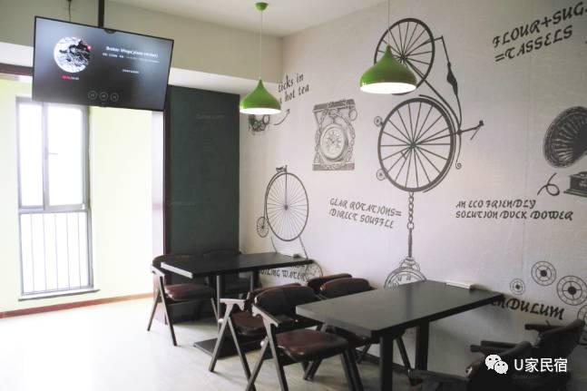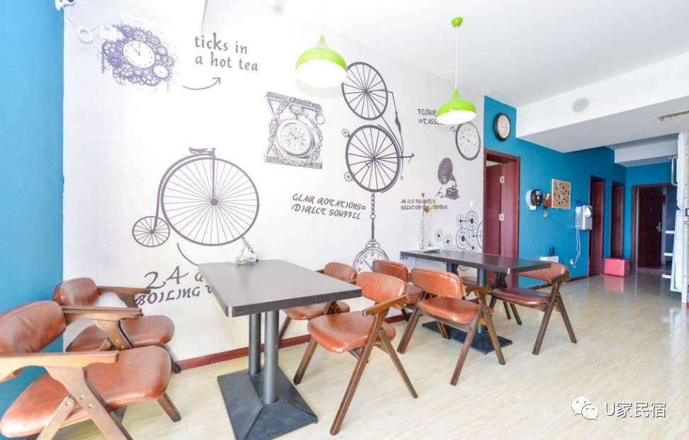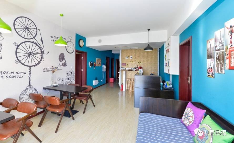 电视悬挂在客厅中间,效果不错。客厅里摆着几张书桌,方便房客们用电脑上上网,或进行些娱乐活动。饮水器就在进门后右手,很方便,设备也很先进。