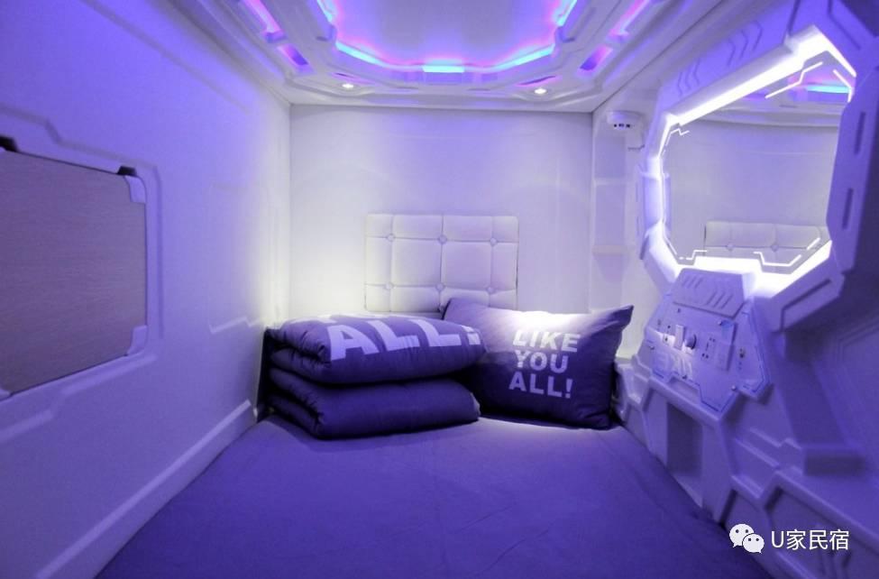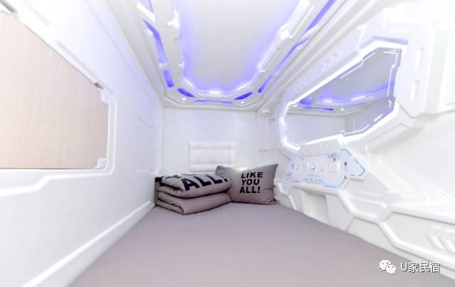 每个人居住的单元是一个长方体的舱位,铺着床垫,放着枕头和被子,睡眠区分设男生区、女生区和普通区,太空舱一人一舱(私密隔音),舱位按男女分为两间,男生这间有6个舱位,和男生房隔着客厅,是女生宿舍。