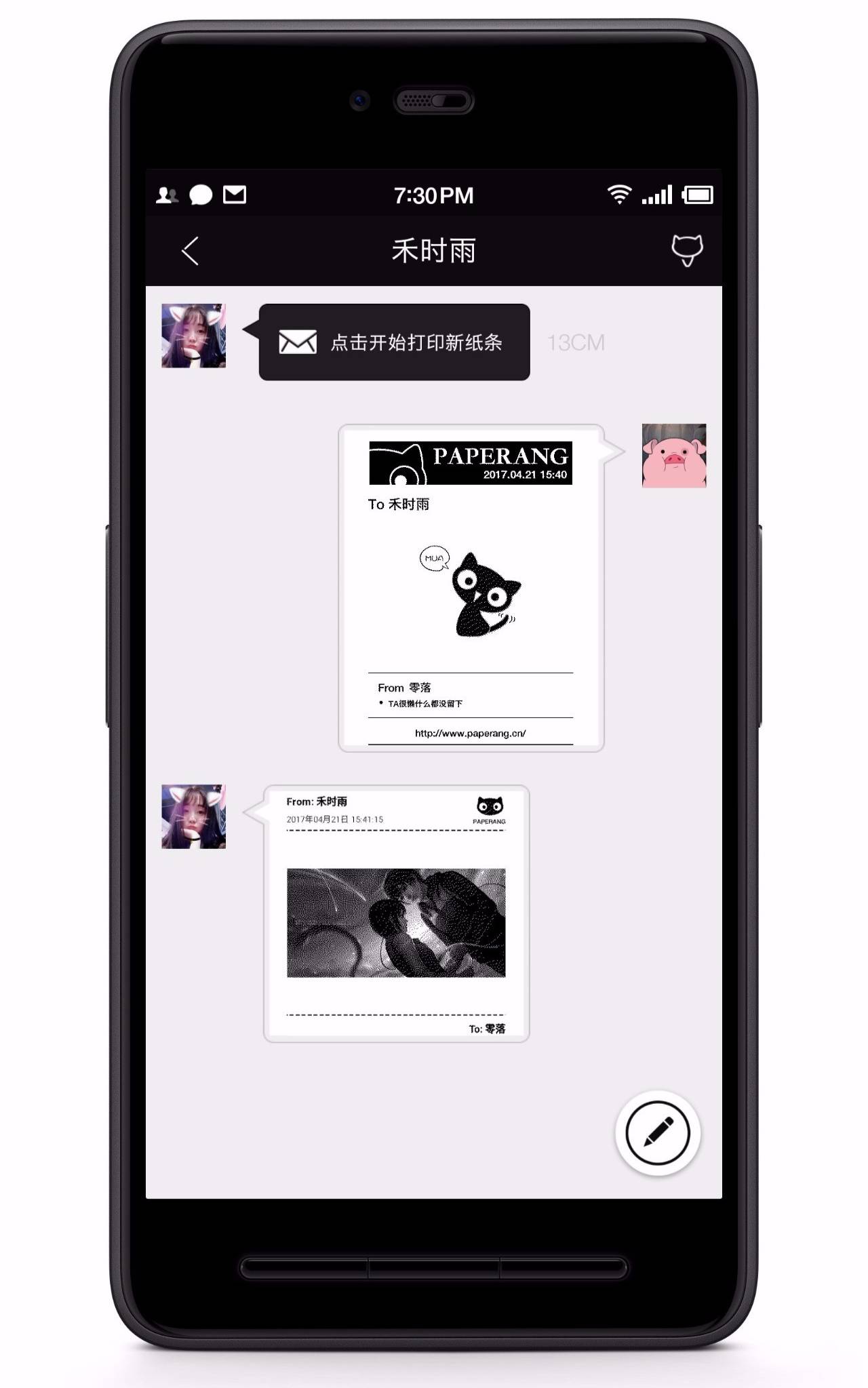 在喵喵机APP中,朋友之间的交流不像社交APP中的即时通讯,但只要连接着喵喵机,当你收到纸条之后喵喵机就马上为你打印出来。