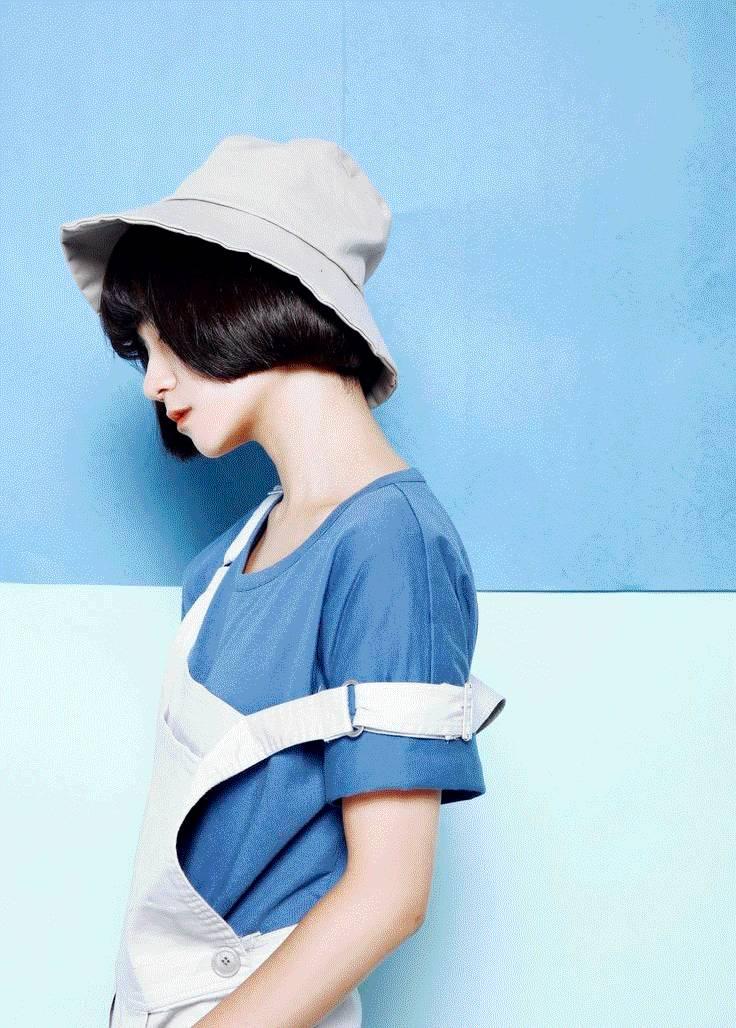 “穿纯色舒适的衣服搭配黑色渔夫帽效果最好,清爽舒适,不出错。”