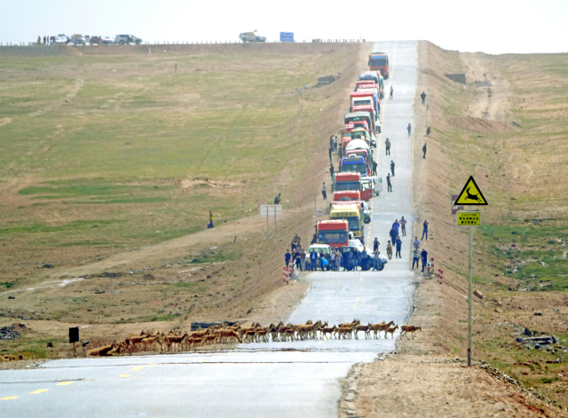 离羊群一公里以外的公路上,所有车辆已停下,注视着。头羊迈上了公路,停顿了一下,回头看了一眼羊群,突然又退了回去。人群紧张了一下,窃窃私语。